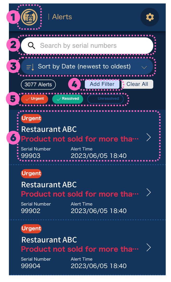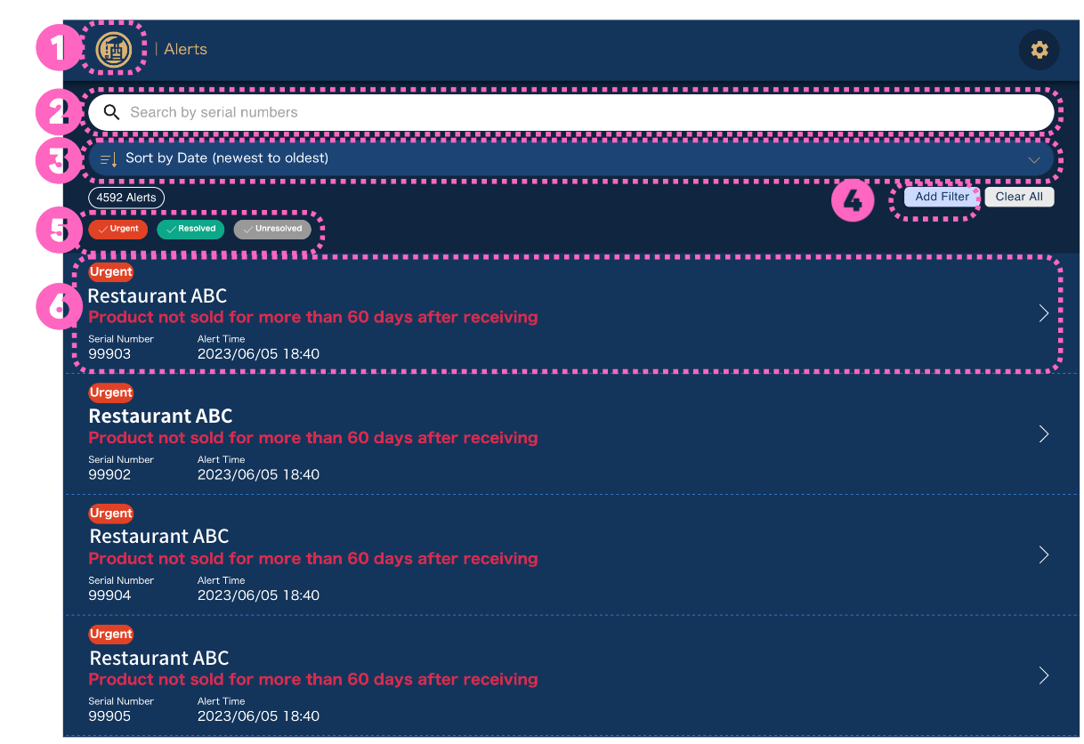 (5) The date and time when the alert was issued is displayed. The time shown here is the local time of the location/country you are in. (e.g. if you are logged in as a user of a Korean distributor, the local time in Korea will be displayed).