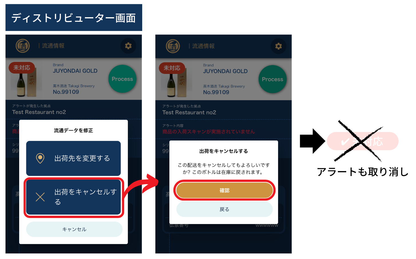 →ディストリビューターの「流通情報」画面または流通履歴登録アプリから配送のキャンセルが可能です。
