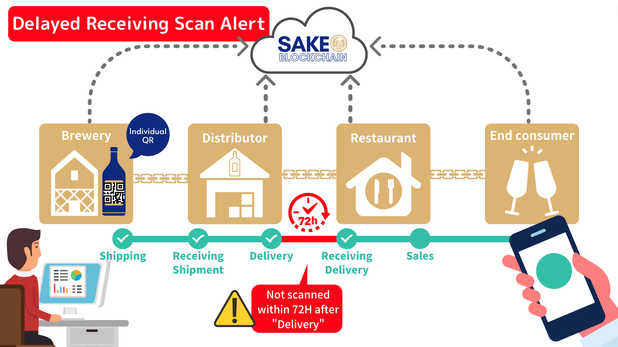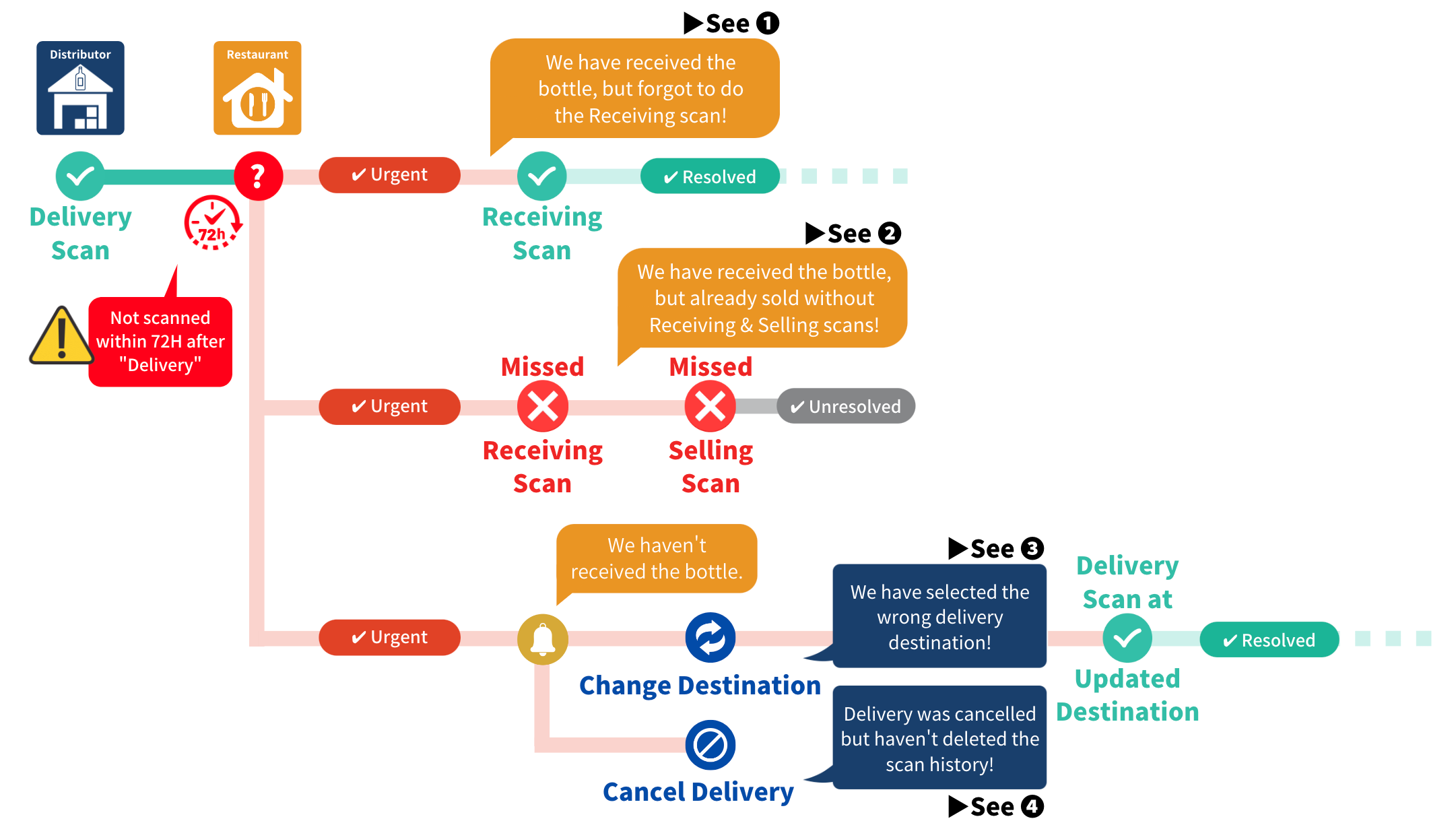 如果產品在經銷商注册送貨掃描後超過72小時未在送貨地點(餐廳)進行收貨掃描,則會顯示延遲收貨掃描警報。