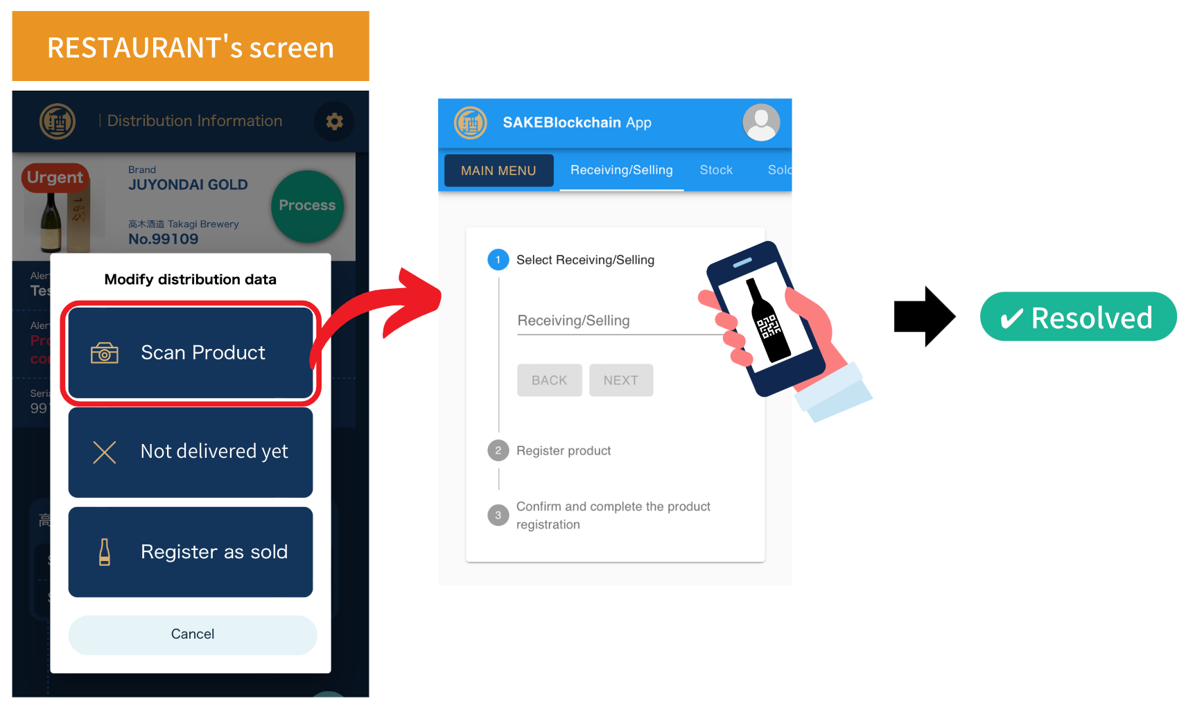 TITLE:[SakeBlockchain] Bottle sold without Receiving AND Selling Scans at