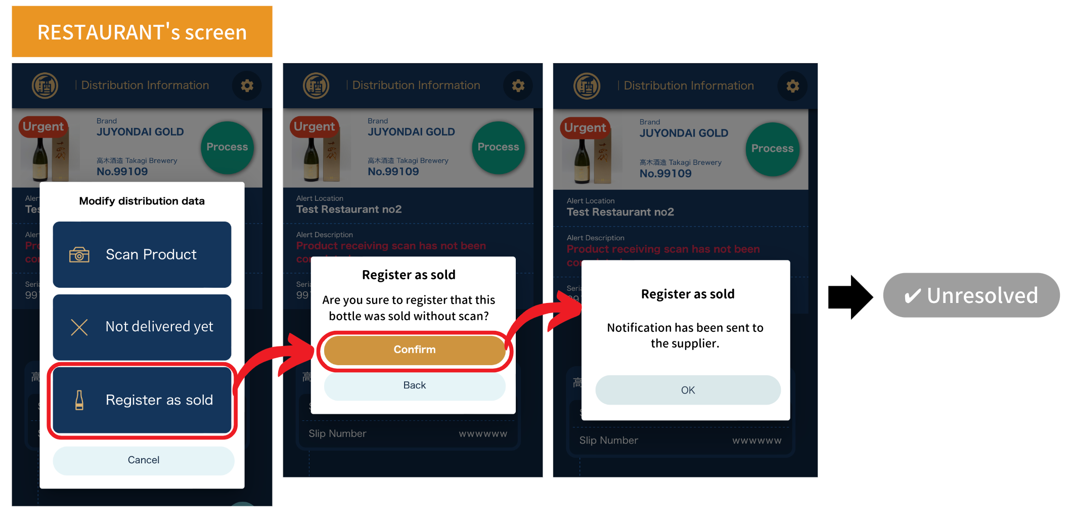 Restaurant's Nameが発生した入荷遅延アラートに対し、入荷スキャンと販売スキャンをせずに販売済みと報告しました。